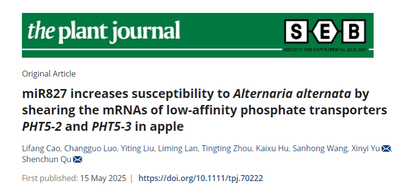 近日,我校999策略手机论坛版渠慎春教授团队在The Plant Journal期刊上发表了题为“miR827 increases susceptibility to Alternaria alternata by shearing the mRNAs of low-affinity phosphate transporters PHT5-2 and PHT5-3 in apple”的研究论文。该研究报道了miR827-PHT5-2/3模块通过调节植株磷稳态调控苹果种质的斑点落叶病抗性。